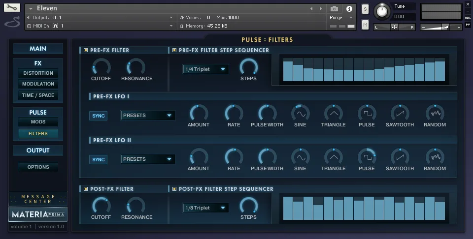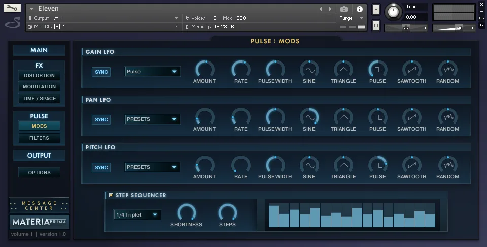 Independently modulate Gain, Pan, and Pitch. Use the step sequencer to generate rhythms. Additional pre and post‑FX filters, each with a step sequencer + two extra pre‑FX LFOs provide extensive options for complex rhythmic design.